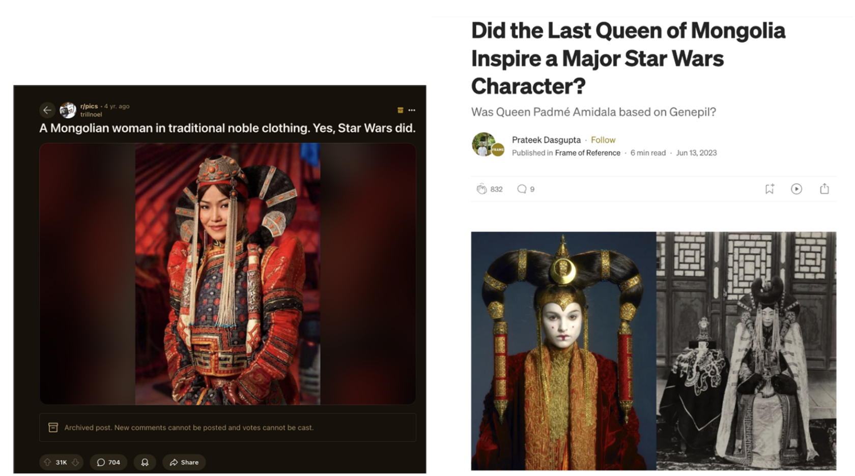 Язык — не единственная часть культуры монгольских народов, которая была использована в Звёздных войнах. Например, в дизайне костюмов Падме Амидалы присутствуют явные заимствования из монгольской одежды знатных женщин. Из-за того, что франшиза Звёздных войн имеет настолько большую мировую популярность и даже культовый статус, небольшие народы, чьи языки и культура использовались в фильмах, становятся чем-то, ассоциируемым со Звёздными войнами. Намного больше людей смотрели Звёздные войны, чем тех, кто смогут показать Калмыкию на карте или назовут хотя бы пару базовых фактов о нас. А многие западные комментаторы в интернете, увидев монгольские национальные одежды знати спешат сообщить о своей ассоциации с героиней франшизы Падме Амидалой.