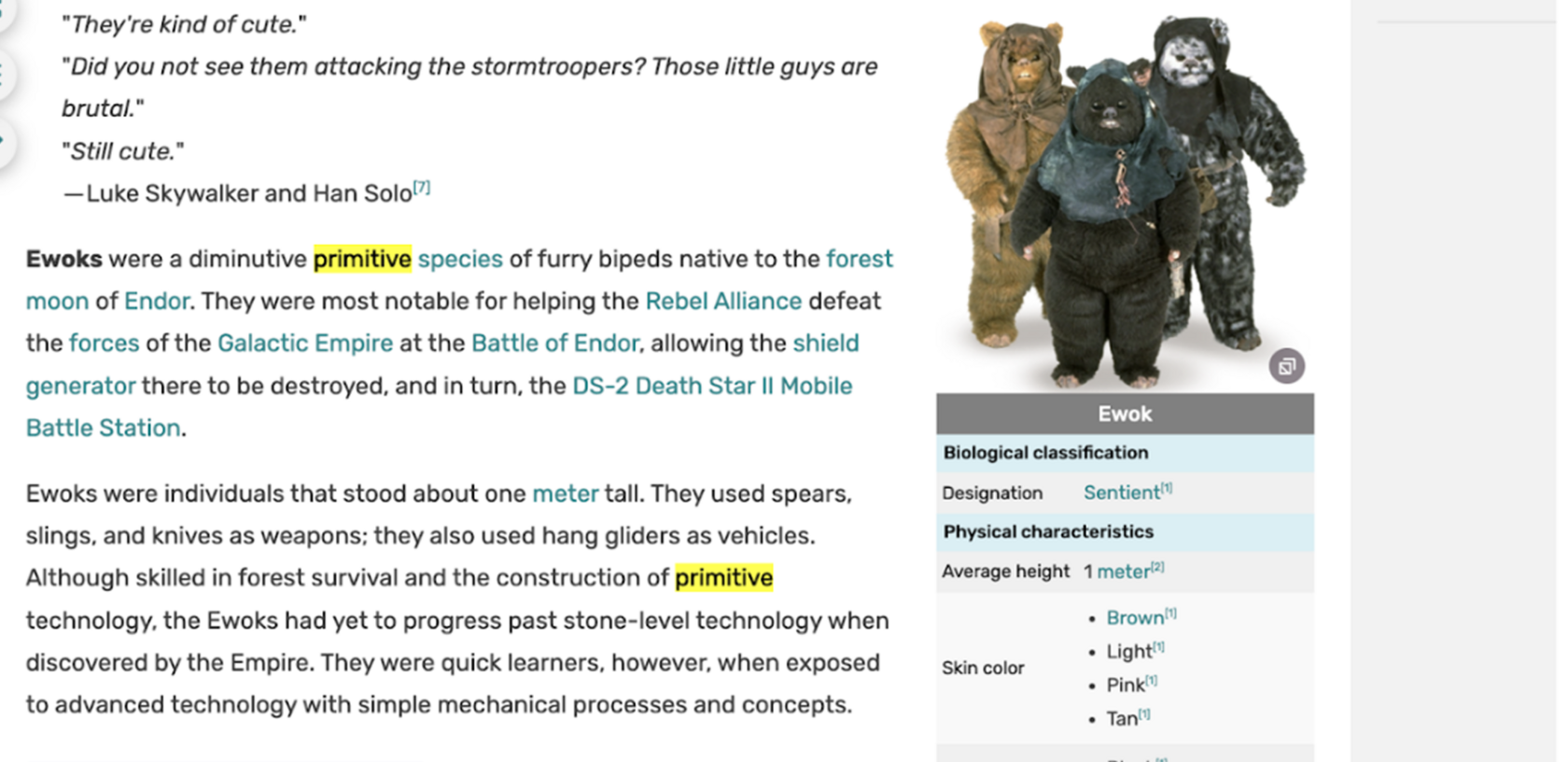 Сама история эвоков как примитивного народа храбрых воинов была основана, по словам Джорджа Лукаса, на бойцах Вьетконга, борющихся против более технологичной американской армии во время войны во Вьетнаме.