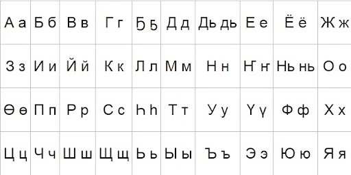 - 5 специфических букв: Ҕҕ, Ҥҥ, Өө, Һһ, Үү;