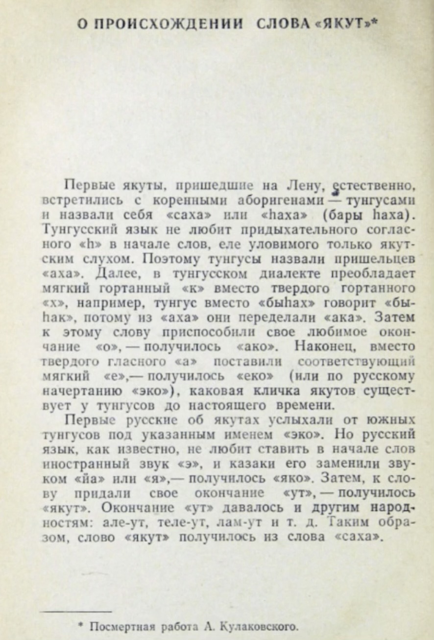 Интересным продуктом такого соседства является слово “якут”, которое, согласно статье учёного-филолога А. Е. Кулаковского “О происхождении слова «якут»”, произошло от слова “саха”.